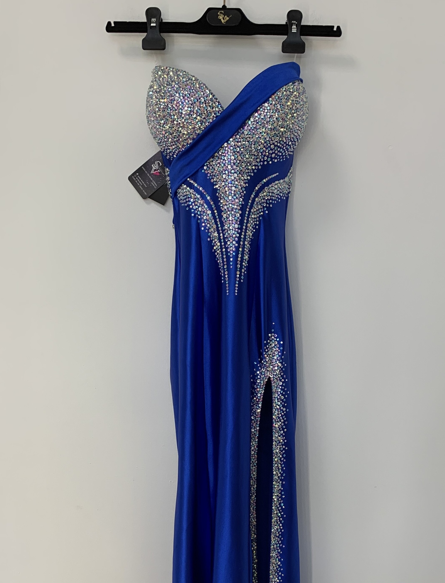 An incredibly ceremonial dress of deep blue color with silver and fantastic train. Electric satin base