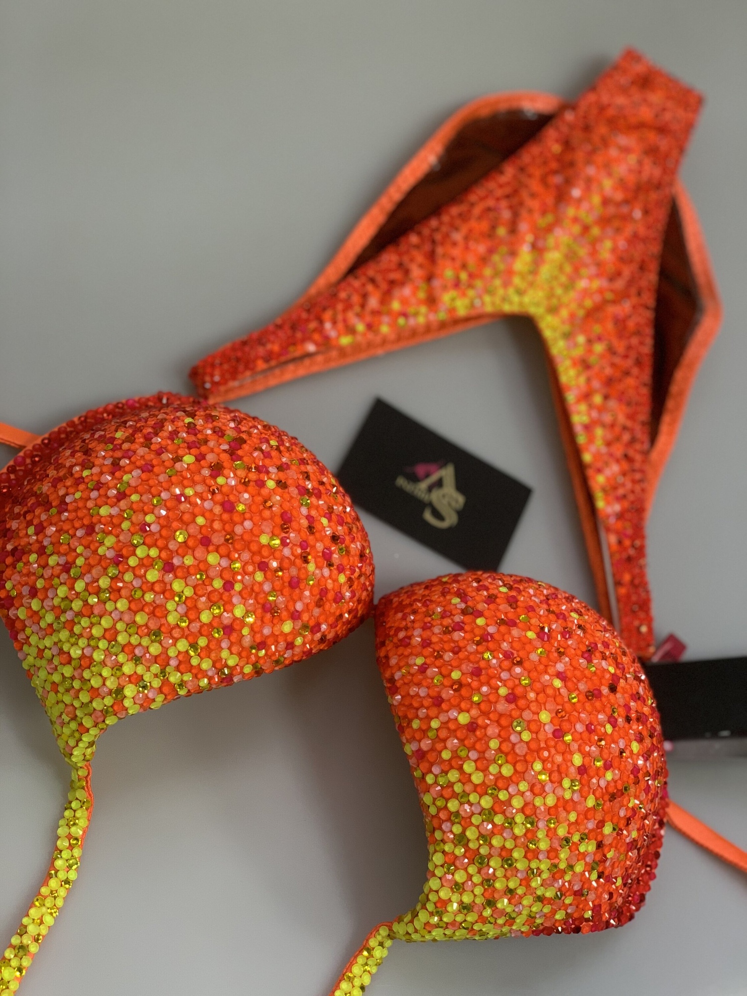Bright colors of the African sun outshine any look on the stage. The design was inspired by the conquest of the high mountain in 2024 by our magnificent Vitalia Drozdova, coowner of SV Bikini. Fiery and hot!