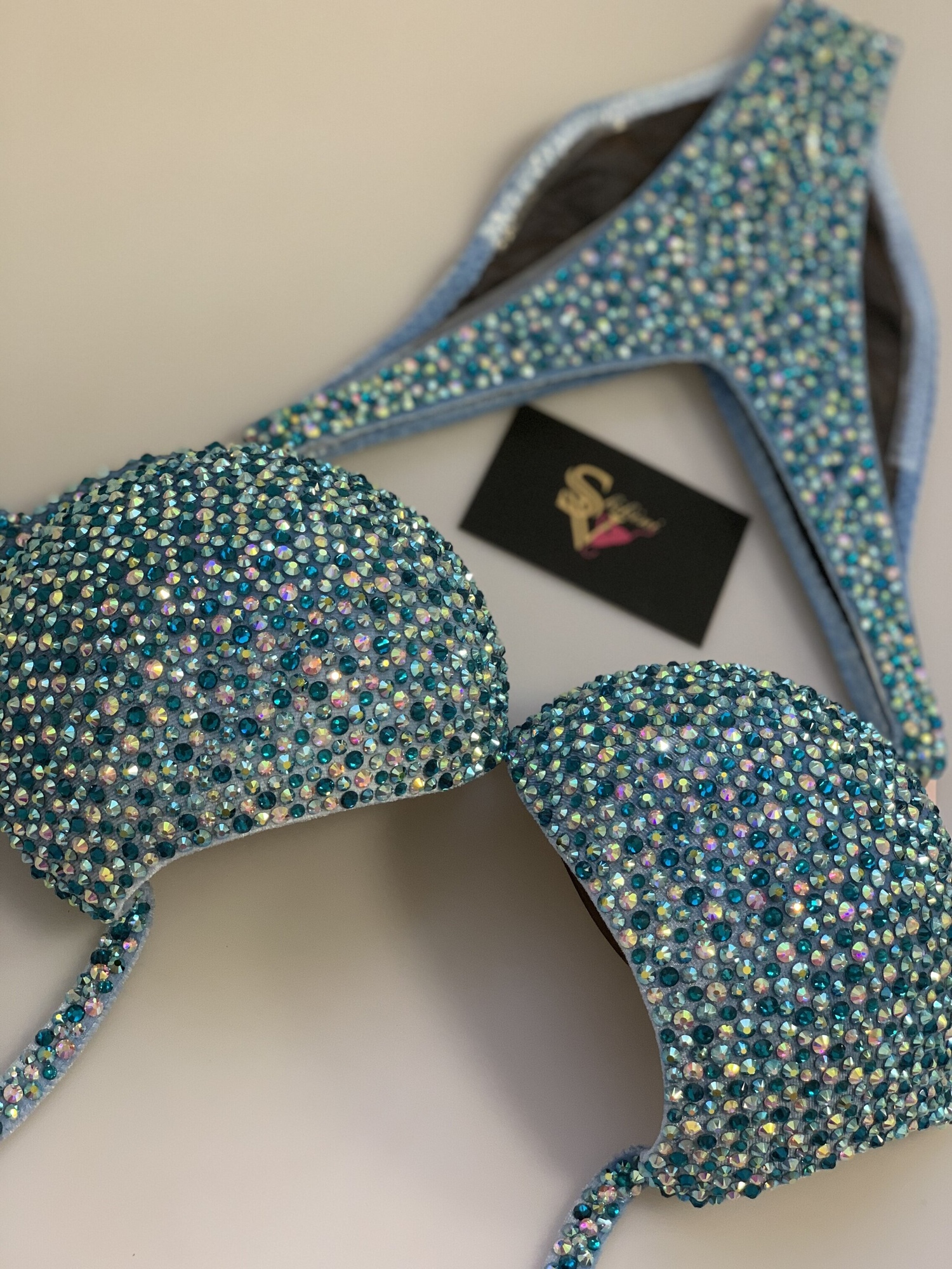 Pale blue velvet base, mix of blue, turquiose stones and chameleons creates a delicate ad shimmering image!